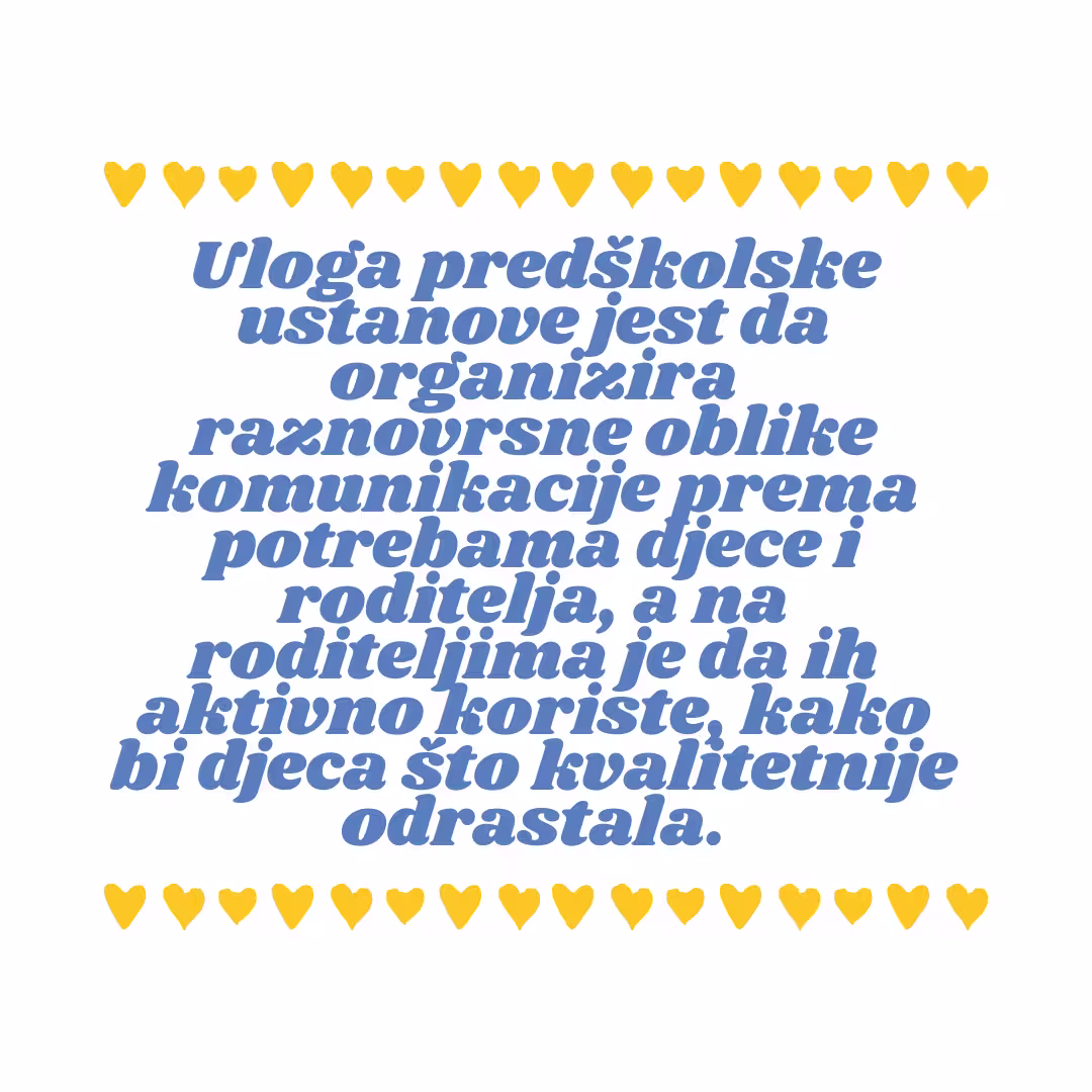 Temelj kvalitetne suradnje može se postaviti korištenjem različitih komunikacijskih alata koje predškolske ustanove nude roditeljima, poput kutaka za roditelje, individualnih razgovora, roditeljskih sastanaka, kreativnih radionica, zajedničkih druženja, svakodnevne razmjene informacija prilikom dovođenja i odvođenja djeteta, zajedničkih grupa, i slično. No, kako bi suradnja postala kvalitetna, važno je osvijestiti da odgovornost za nju ne snosi samo jedna strana, već je to zajednički zadatak predškolske ustanove i roditelja (Mašković i sur., 2018).