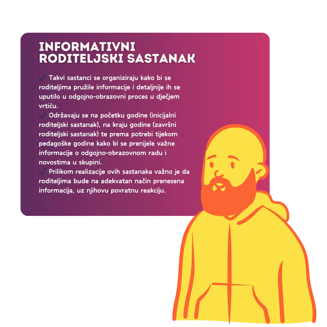 Informativni roditeljski sastanci organiziraju se s ciljem da se roditeljima pravovremeno i jasno prenesu važne informacije vezane uz odgojno-obrazovni proces u vrtiću. To su susreti koji pomažu roditeljima da se lakše snađu, bolje razumiju što se u skupini događa i osjećaju se uključeno i sigurno.