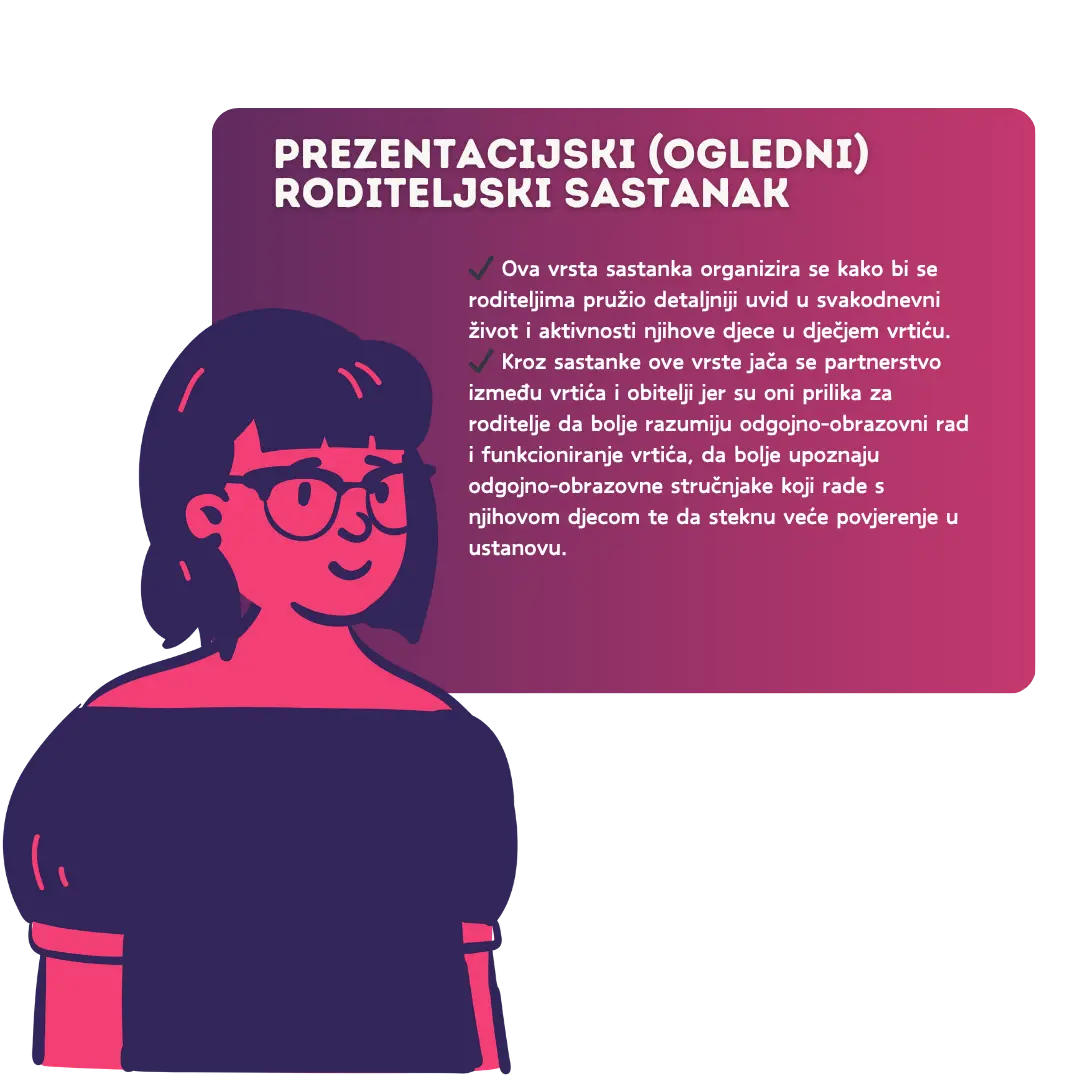 Prezentacijski roditeljski sastanci organiziraju se kako bi se roditeljima pružio detaljniji uvid u svakodnevni život i aktivnosti njihove djece u vrtiću. Kroz takve susrete vrtić otvara vrata svoje prakse i poziva roditelje da iz prve ruke dožive ono što djeca svakodnevno žive.